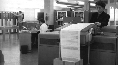 Les échanges entre deux équipements (ordinateurs par exemple) sont rendus possible par des transmissions série (protocole RS232) mais demeurent restrictives. L'échange entre plusieurs postes simultanément étant le réel besoin. Ci-contre : IBM705 de 1960. Il occupait plusieurs pièces d'un immeuble. |