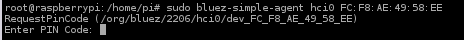 sudo bluez-simple-agent hci0 FC:F8:AE:49:58:EE